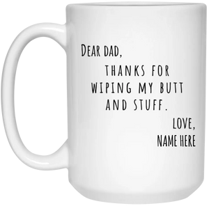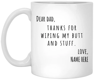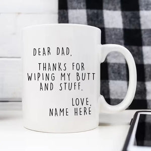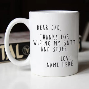 Introducing our hilarious and playfully cheeky dad mug - the perfect Father's Day or new parent gift! This high-quality ceramic mug features the amusing phrase "Dear Dad, Thanks for wiping my butt and stuff. Love, [Name Here]" printed in bold letters.
